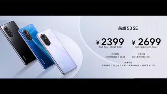 除了2699元起的荣耀50、3699元起的荣耀50 Pro,荣耀50系列还有一款相对更低端的荣耀50 SE,设计、配置都有所不同。荣耀50 SE有两个版本,8GB+128GB 2399元、8GB+256GB 2699元,今晚21点半预售,7月2日10点08分线上线下开售。