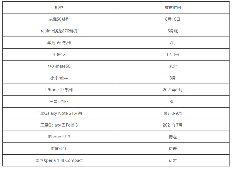 以上是小编整理的有关2021下半年手机新品发布时间表和下半年会出什么手机的相关资料信息,希望能够对大家了解相关情况有所帮助,想获得更多消息资讯请关注jrs直播!