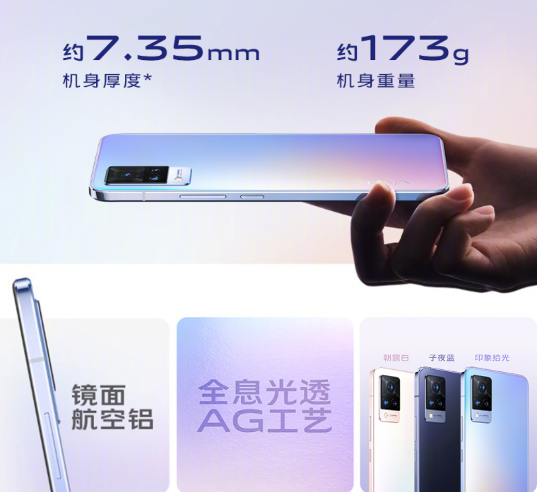 该机厚度 7.35mm,重 173g,有“朝露白”、“子夜蓝”、“印象拾光”三款配色。