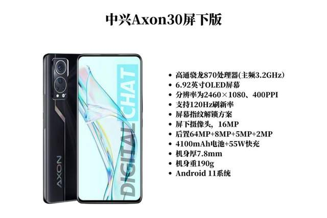 从公开的认证信息以及网上资料来看,中兴AXON30屏下摄像头版是骁龙870旗舰,也就不存在骁龙888那样过热的问题。手机的屏下摄像头为1600W像素规格,后置则是6400W像素四摄,整体上中规中矩。电池容量4100mAh搭配55W快充,算是主流水准,不过机身重量只有190克、厚度7.8mm,应该会带来非常好的手感。