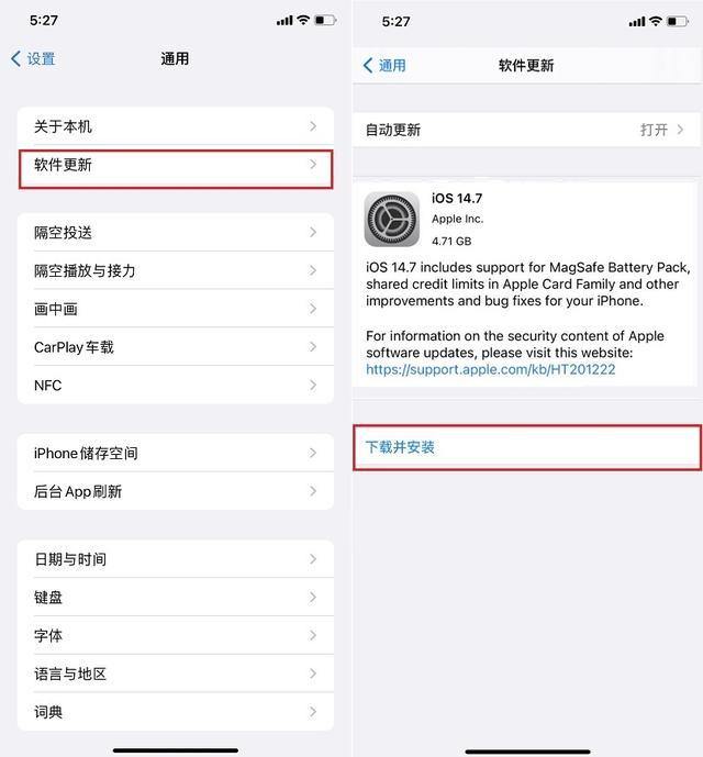 对于iOS 14.7以下版本的普通正式版用户,可以在连接 Wifi 网络后,打开 iPhone 的 设置 -> 通用 -> 软件更新 页面,即可检测到新版更新,点击下方的「下载并安装」,根据提示完成在线升级即可,升级操作非常简单,如图所示。
