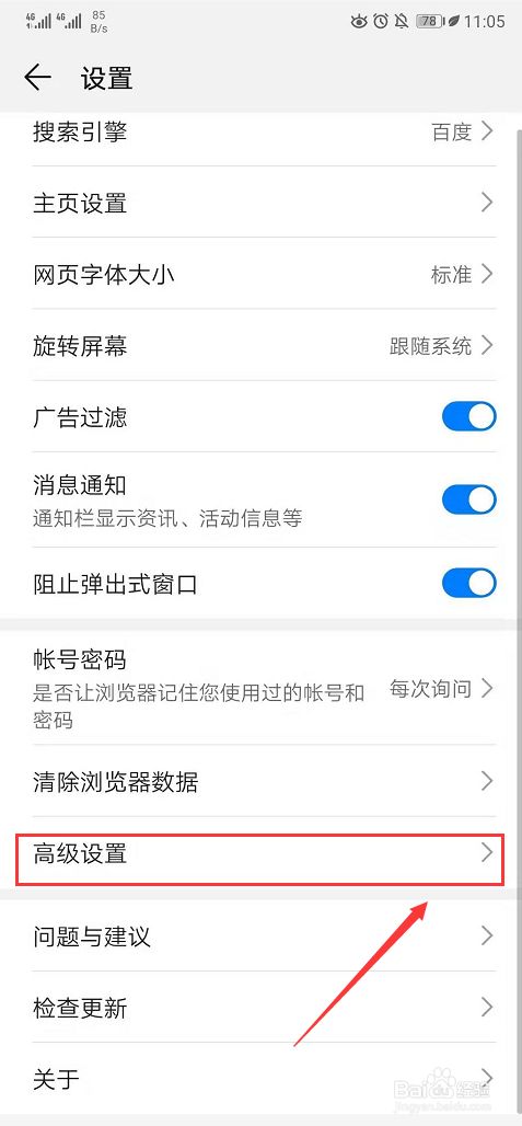 进入到浏览器的详细设置页面后,选择【高级设置】,点击右侧的小箭头进入到详细页面