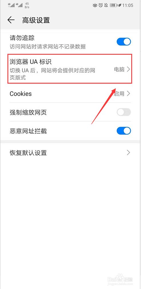 进入到【高级设置】后,选择【浏览器UA标示】,点击右侧的小箭头进入到详细设置页面