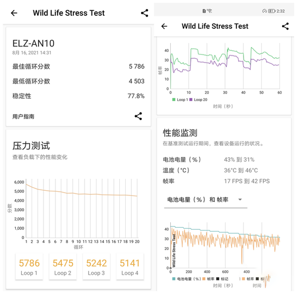 为了验证荣耀 Magic3 Pro 的性能释放稳定性,我们先来进行一下压力测试,3DMark 提供了压力非常大的测试项目《wild life stress test》,在笔者过去测试骁龙 888 的手机时,经常会遇到无法跑满 20 分钟就过热关闭的情况,但在荣耀 Magic3 Pro 上,不仅顺利跑完,而且手机没有发生瞬时降频,而是平缓下降,在最热时仍然保留了近 80% 的性能,可以说荣耀的确有对旗舰级处理器做针对性的优化,最终最高分 5786,最低分 4503。