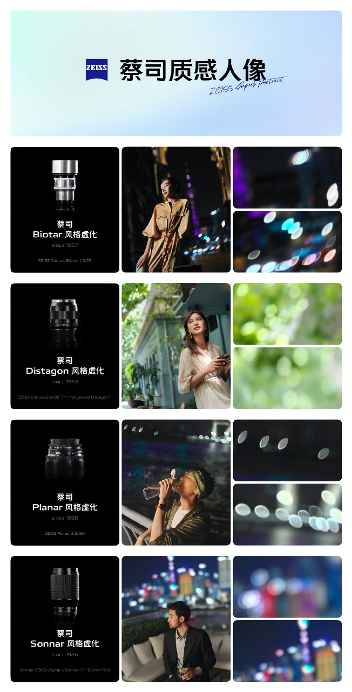 vivo 和蔡司共同选取蔡司 ZEISS Contax Biotar 1.5/75、ZEISS Contax Distagon 2.0/28 T*、ZEISS Hasselblad Planar 2.8/80、ZEISS Olympia Sonnar T* 2.8/180 这四款经典镜头复刻到 vivo X70 系列中,组成全新的「蔡司镜头包」,让普通用户也能轻松拍出蔡司经典镜头的人像风格。