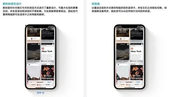 重新设计的 Safari 浏览器优化了屏幕空间,并且突出正在观看的内容,新标签页栏也更紧凑,悬浮在屏幕底部,标签页之间的切换更加方便。
