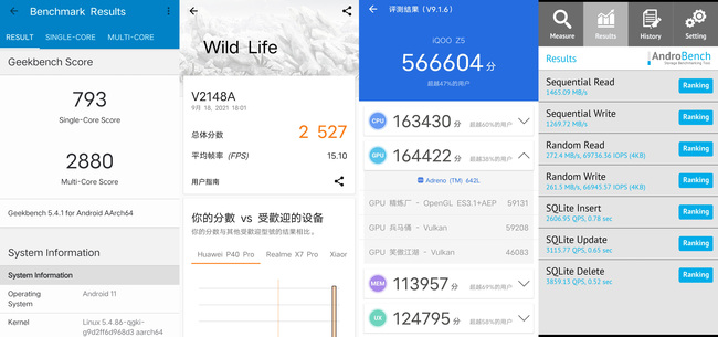 软件跑分成绩来看,iQOO Z5达到了同级中的前列水准。Geekbench 5单核成绩793,多核2880;3DMark WildLife项目得分2527;安兔兔V9.1.6总分56.6W;Androbench顺序读写分别为1465.09、1269.72 MB/s,随机读写分别为272.4、261.5 MB/s,更快的读写速度不仅在载入大文件时拥有优势,日常打开应用等操作也会更快更流畅。