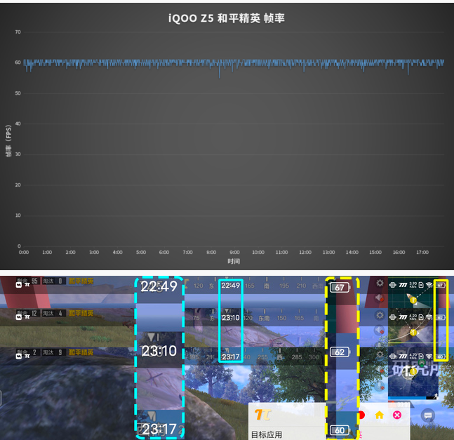 使用《王者荣耀》与《和平精英》两款热门手游进行测试。首先是《王者荣耀》,选择测试版本固件默认能开启的最高画质「高帧率+超高分辨率」。单局人机帧率记录如图,iQOO Z5的帧率表现非常稳定,平均帧率达到了60.43FPS,最低帧率也有56FPS,实际操控体验流畅。