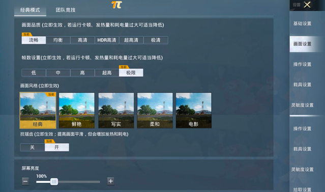 接下来是负载更高一些的《和平精英》,射击游戏优先保证帧率,选择「流畅+极限(60FPS)+抗锯齿开」画质。