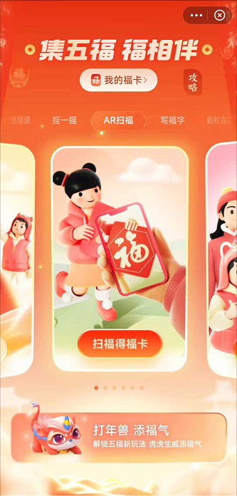 (2)用户通过AR扫任意福字、写福字、蚂蚁森林、蚂蚁庄园、摇一摇、看支付宝生活频道等集福方式有机会获得未激活的生肖卡