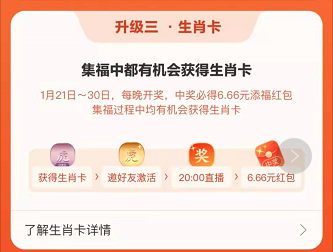 (4)激活生肖卡的用户,可以参与到当天晚上20:00千的开奖资格,通过开奖的生肖和自己当天激活的生肖一致,则可以获得卡面呈现的天赋添福金额。用户每日有机会获得1张生肖卡