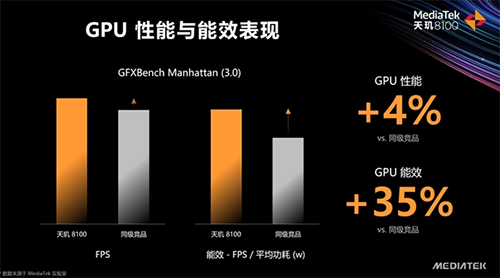 按照官方说法,天玑8100对比同级别竞品(骁龙888) CPU多核性能高12%、多核能效高44%,GPU性能高4%、能效高35%,APU AI能效基准测试高39%,背景虚化效果测试性能高62%、能效高72%。
