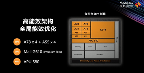 天玑8100采用的是台积电5nm制造工艺,CPU为八核心,包括四个A78、四个A55,同时还有4MB三级缓存,GPU则是六核心的Mali-G610,另外还有第五代AI处理器APU 580,包括两个性能核心、一个通用核心。
