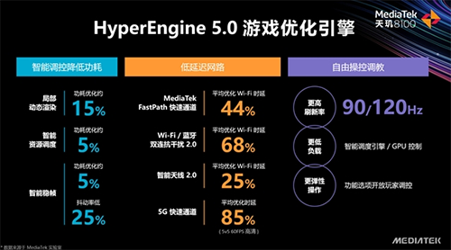 为了游戏优化性能,天玑8100集成了HyperEngine 5.0优化引擎,一是可智能调控降低功耗,局部动态渲染、智能资源调度、智能稳帧分别降低约15%、5%、5%,还能让抖动率降低25%。