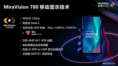 显示方面集成MiraVision 780移动显示引擎,只比天玑9000略低一个档次,支持WQHD分辨率、120Hz高刷、高色准DeltaE、HLG/HDR10/HDR10+标准、4K60 AV1 HDR视频、即时屏幕动态帧率调整、AI SDR-HDR显示增强、全链路HDR10+。