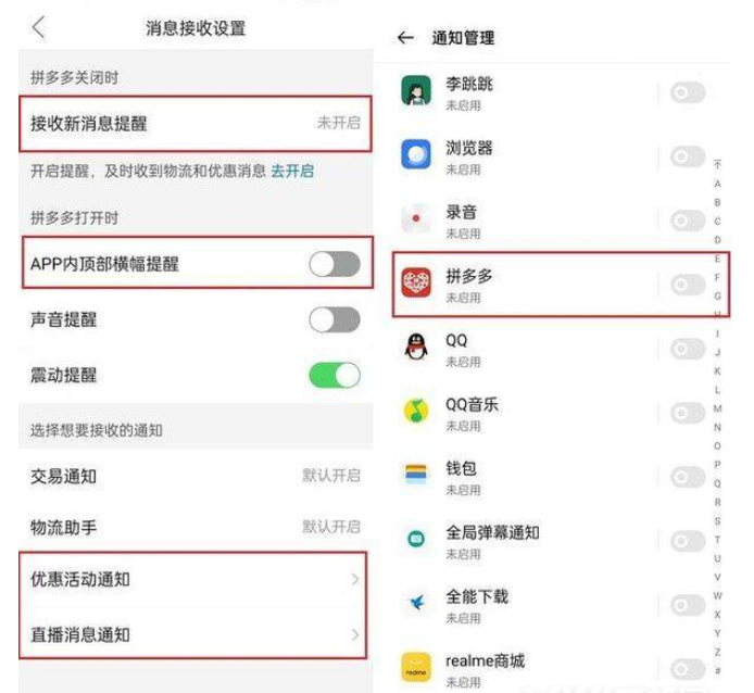 2、很多情况下,即使拼多多关闭时还能收到广告弹窗消息,那是因为你没有将“接收新消息提醒”关闭,通常情况下在手机系统自带的的“设置”App里,找到“通知与状态栏”-“通知管理”,将拼多多APP后的开关调整为关闭状态即可关闭,不同的手机位置可能不同。接着再把“APP内顶部横幅提醒”右侧的开关给关掉,如图所示:
