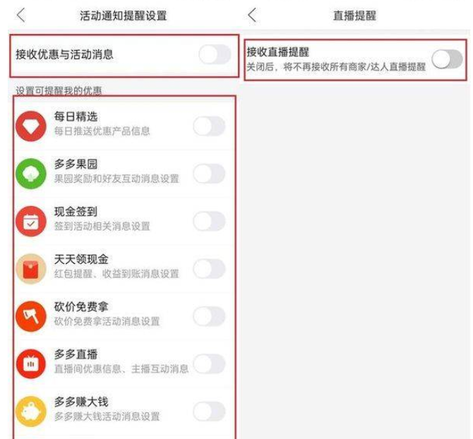然后点击“优惠活动通知”,进入“活动通知提醒设置”界面,将“接收优惠与活动消息”以及下面的每日精选、现金签到、多多直播、多多果园等后面的开关关闭即可。然后返回上一个界面,点击“直播消息通知”,将“接收直播提醒”右侧的开关给关掉。