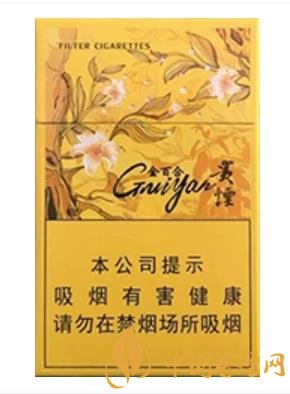 贵烟(金百合)售价10元/包。香烟包装整体色调暖黄、明亮,对比色彩比较突出,是一款颜值较高的香烟,虽然价格并不是很高,但是制作的非常精细。香气明亮透发、底香厚实丰富,劲头适中,浓度适中,余味较舒适,具有较好的香气满足感和生理满足感。
