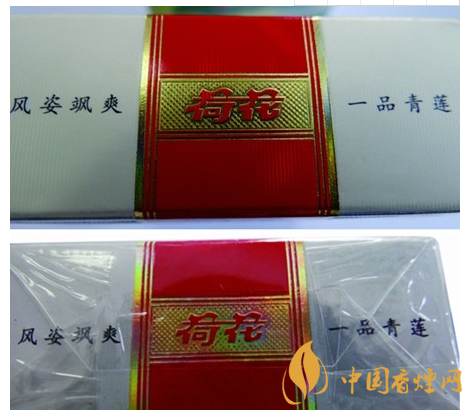 真烟小盒顶部印刷工艺清晰饱满,其中间“荷花”字体凹凸层次感强;假烟印刷工艺粗糙,其中间“荷花”字体无凹凸层次感,与其真品印刷工艺存在明显差异。