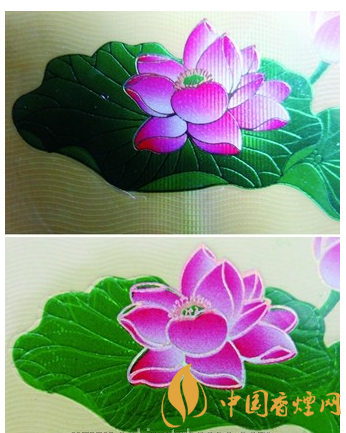 真品小盒正面商标纸印刷采用凹凸烫金技术,其荷花立体感突出,荷花花蕊清晰;假烟多高清晰照相扫描进行仿制,套色烫金不准,花蕊模糊,其图案效果与真品存在明显差异。