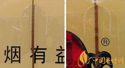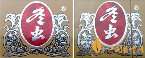 2.注册商标图案。真品卷烟采用起凸工艺商标印刷,图案细节起凸完美,眼观、手摸凹凸感明显。该款假冒卷烟商标印刷起凸工艺较差,部分细节未做起凸,手摸图案平滑。(图2左真右假)
