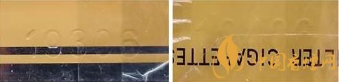 3.钢印特征。真品卷烟钢印打印的数字感觉较为粗糙,有力度感且排列不整齐。该款假冒卷烟钢印打印比较轻,无力度感且排列整齐。(图5左真右假)