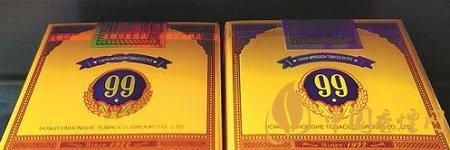 左真右假 真烟中间的“99”图案,整体偏蓝色,色彩过渡自然,呈现中心浅外围深渐变效果。假烟中间的“99”图案,色彩无明显过渡效果,整体偏黑色,套印也不准。