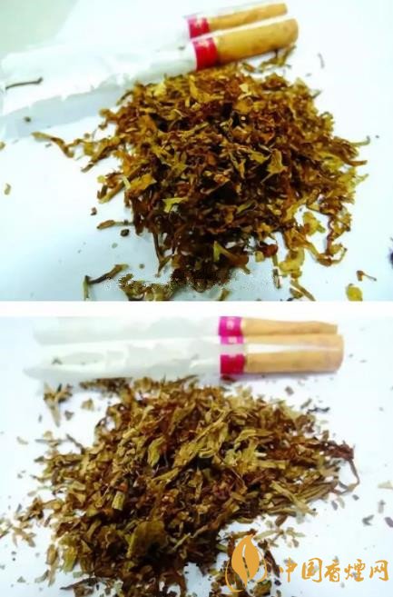 真品烟丝配比均匀,颜色呈现橙黄色,烟丝油润性强,叶丝有弹性,叶丝掺配比例大;