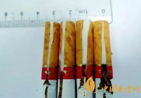 假烟滤嘴棒长度小于2.5cm,不撕破接装纸判断时,用手轻捏滤棒长度只到接装纸金线圈处,与真品烟滤嘴棒长度差异明显。(左两支真 右两支假)