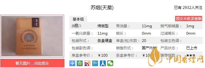 苏烟天星烟支长84mm,采用国际最新的DCC+HXD技术,从外观设计到内在品质都力求尊贵、精工制作、手工打造,追求最高品质、最高档次、最高品位。下面我们一起来看苏烟天星的参数信息:焦油量:11mg 烟碱量:1.0mg 一氧化碳量:11mg