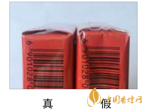 小盒侧面灯笼图案的印刷对比:真烟的三个小方格中,下面那个方格的最下面那一横为水平的;假烟下面那个方格的最下面一横非水平,呈一定角度倾斜。