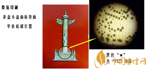 5.用放大镜查看条盒小盒商标背面华表底部位置,可以看到黑色“★”、黄色“YC”字母。