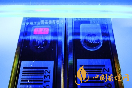 商标纸印刷工艺差异对比:真品小盒商标纸选用光柱镭射卡纸,采用凹凸烫金一次成型技术,小盒正面商标图案和字迹清晰且凹凸感明显,烫金部分光滑无格纹状;假烟小盒仿制粗糙,烫金套印不准,商标图案部分仿印有明显的格纹状,与真品印刷工艺存在明显差异。