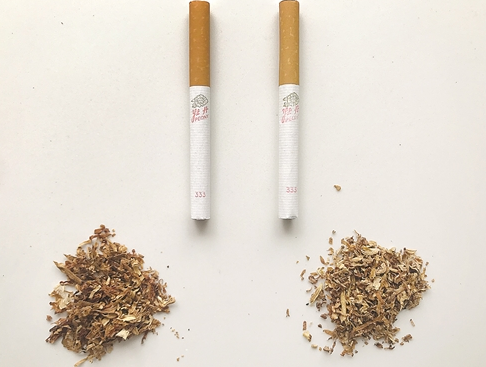 真假烟支烟丝特征对比:假烟滤棒颜色较浅,“牡丹”二字和“牡丹”图案比真烟大,烟支数字钢印字体粗糙、模糊。真烟烟丝宽度整齐,碎末较少,较为油润;假烟烟丝成分较杂,含较多的烟梗,十分干涩。