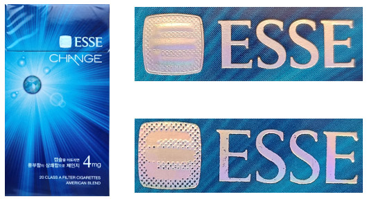 真品卷烟银色烫金字母“E”的笔画立体饱满,有明显中间凸边缘平的视觉效果。银色圆点与“ESSE”字母烫金清晰完整,无掉金、漏烫现象(正面与背面图案相同)。假冒卷烟银色烫金字母“E”的笔画无立体感,银色圆点与“ESSE”字母烫金有漏金、掉金现象。