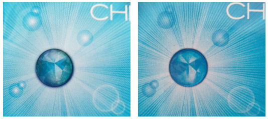 真品卷烟的蓝色爆珠图案较为饱满,侧光观察有圆润感,色彩变化明显。边缘的珠子中间为较为明显的纯白色。假冒卷烟蓝色爆珠图案扁平,侧光观察无圆润感。边缘的珠子中间为淡蓝色,白色不明显。