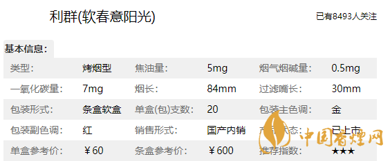 利群(软春意阳光)采用国内顶级的降焦技术,配以一级香烟原料精心调制而成。它是国内低烤香烟中的经典高端之作。它的焦含量仅为5mg,香烟品质卓越,烟香飘逸,口感醇香怡人,深受高端消费群体的青睐。据小编调查得知市场售价为60元/包。
