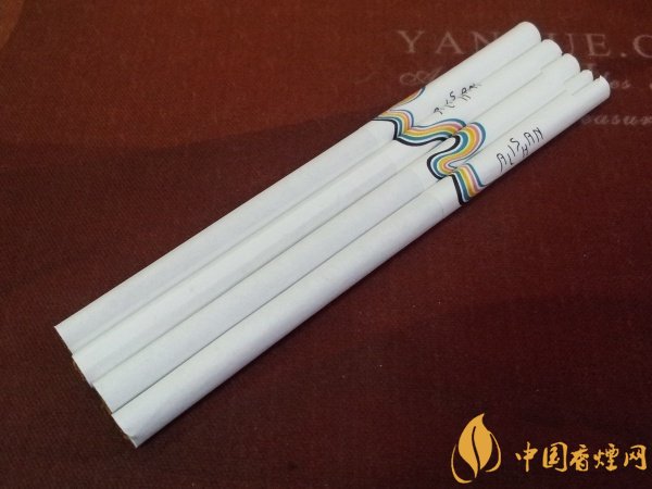 烟支通体纯白,白到卷烟纸上连竖的或是横的纹理都没有。白色的水松纸上除了阿里山的Logo外,还飘荡着一条“蓝白红白黄白蓝白黑”的“几”字形丝带,很是夺目。
