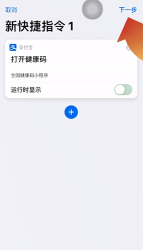 2.进入添加页面后点击“打开健康码”选项,滑动按钮关闭“运行时显示”,接下来点击下一步,