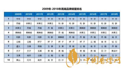 到2018年,「中华」销量稳定在135万箱以上,市场份额保持在42%以上,「利群」以35万箱销量位居第2位,「黄鹤楼」接近25万箱,「芙蓉王」、「南京」和「钻石」突破10万箱。和2009年相比,10万箱以上品牌从3个增加到7个,5万箱以上从1个增加到7个,万箱以上品牌达到11个,市场的成长性与品牌的爆发力形成了线性的相得益彰。