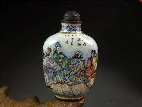 鼻烟壶,就是盛鼻烟的容器。清代文物。小可手握,便于携带。鼻烟是一种烟草制品,系将烟叶烘烤、去茎、磨粉、发酵并加入香料配制而成,用鼻嗅服。鼻烟17世纪前期在欧洲开始流行,后期传入中国。中国最初并无特制容器,自清代道光年间由宫内养心殿造办处特制鼻烟壶,壶盖内附小细匙,以便舀取烟粉。康熙年间清宫造办处制造的玻璃、铜胎画珐琅等各种鼻烟壶,开辟了一项工艺美术的新门类。清宫造办处经常做鼻烟壶的作坊有玻璃厂、珐琅作、玉作、牙雕作和镶嵌作;壶盖、勺由镀金作或牙雕作配制。咸丰、同治以后,官办作坊用贵重材料制作的鼻烟壶显著减少,多为玻璃、瓷制品。这时民间作坊的产品大量出现,造型较单调,装饰图案中出现历史人物、戏剧情节、市井风俗等题材。清末出现内画壶,在玻璃或水晶烟壶磨砂的内壁上反画人物、山水、花鸟等,堪称精品。20世纪70年代后,内画壶发展迅速。