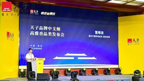 重庆中烟党组成员、副总经理雷樟泉为发布会致辞。雷樟泉在致辞中回顾了重庆中烟在中支烟战略推进上的奋进求索历程,分享了天子品牌在中支烟赛道上不断实现突破的发展成果。他指出,经过三年的不懈努力,重庆中烟做大做强中支烟的目标更加清晰、信心更加坚定、保障更加有力。他强调,天子品牌的中支烟高雅香品类,以“高品质、高精技、高标准”来诠释高雅感知,形成了“有支撑、成体系、可感知”的高雅风格特质,是天子中支烟发展的里程碑,标志着天子品牌发展进入加速成长新阶段、新境界。