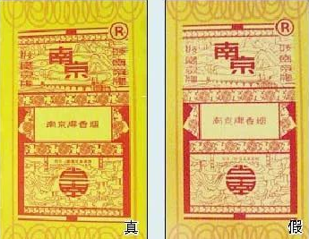 真烟条盒侧面、小盒底部的老南京注册商标图案,红色以外的底色部分发黄;假烟的老南京注册商标图案发白,图案模糊。
