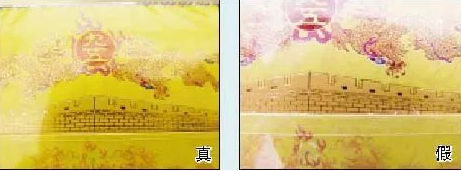 真烟上的城墙图案印刷精致,城墙砖缝线条工整清晰;假烟的城墙图案印刷粗糙,烫金效果差,会出现城墙砖缝线条断开、加粗、模糊等现象。
