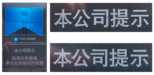 真品卷烟的商标印刷采用凹印,银色中文字体和英文字母,银色与黑色边缘有锯齿痕迹。菲利普莫瑞斯国际公司图标,采用商标起凸工艺,图案凹凸明显,图案边缘有虚边。