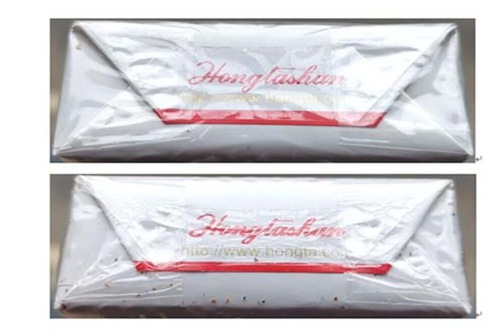 6、红塔山(软经典1956)正品底部透明纸烫封收缩均匀、自然,有烙铁痕迹,商标纸拐角折叠空隙较大。假冒卷烟透明纸烫封收缩杂乱、死板,水汽较重,商标纸拐角折叠紧实,无空隙。