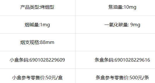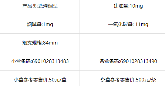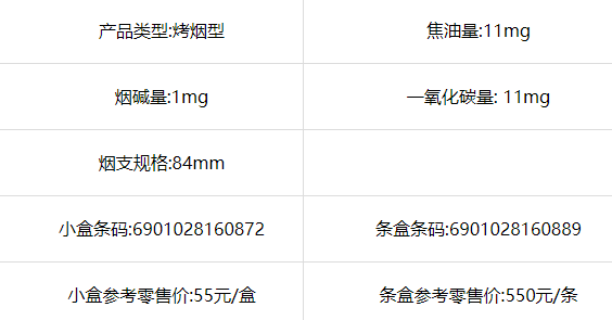 | 类型 :烤烟型 | 焦油量 :11mg | 烟气烟碱量 :1mg | 一氧化碳量 :11mg |