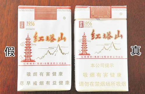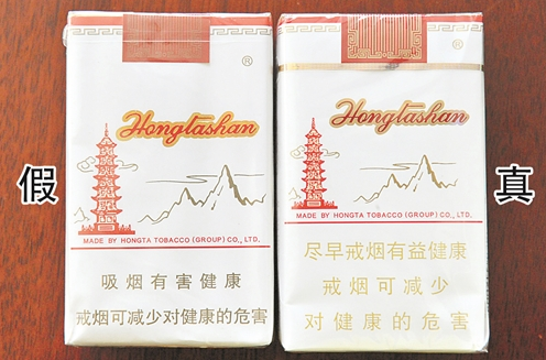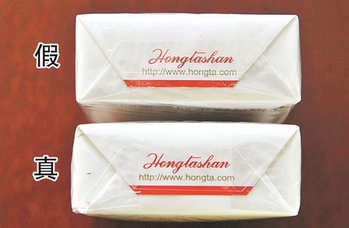 商标纸背面印刷工艺差异对比:真烟红塔上部的拼音凹凸明显,烫金轮廓线套印准确;假烟烫金轮廓线套印偏差较大。