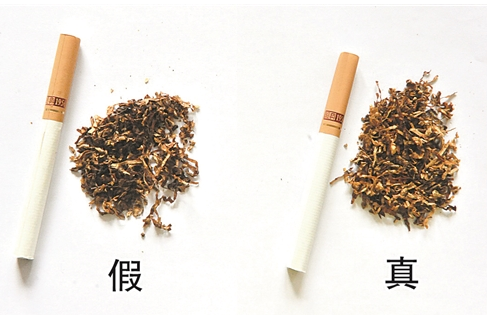 烟丝差异对比:真烟烟丝切丝宽度与长度适中均匀,光泽油润性好,柔软疏松,含碎末少,烟丝结构为叶丝、膨胀梗丝和造纸法再造烟叶;假烟烟丝工艺粗糙,色泽发暗无光泽,含碎末较多,烟丝结构一般为叶丝和没有经过膨胀处理的梗丝,无造纸法再造烟叶。