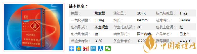 | 类型 :烤烟型 | 焦油量 :10mg | 烟气烟碱量 :1mg | 一氧化碳量 :11mg |